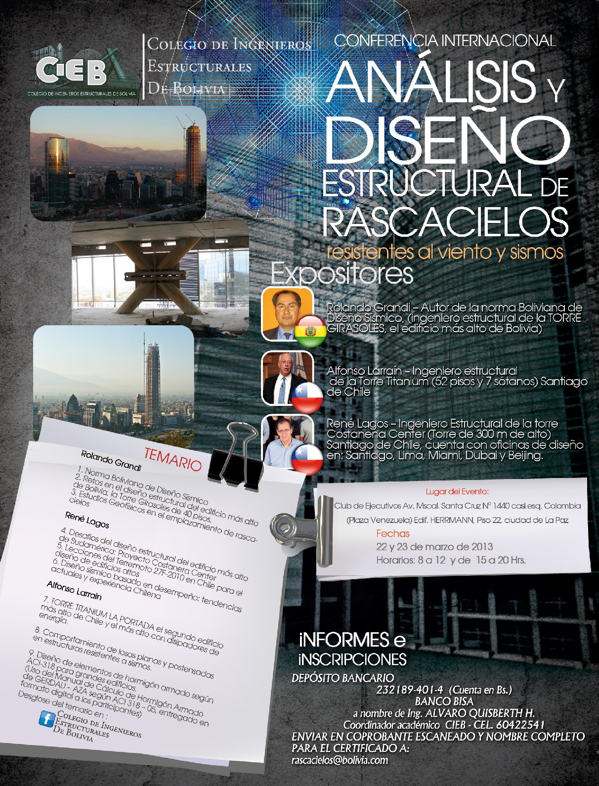 El Colegio de Ingenieros Estructurales de Bolivia inicia sus actividades de actualización profesional, organizando la primera Conferencia Internacional de Análisis y Diseño Estructural de Rascacielos Resistentes al Viento y Sismos, contando con la participación de los ingenieros que realizaron el diseño del Edificio más alto de Sudamérica, El edificio más alto de Chile con disipadores de energía y el Edificio más alto de Bolivia.
