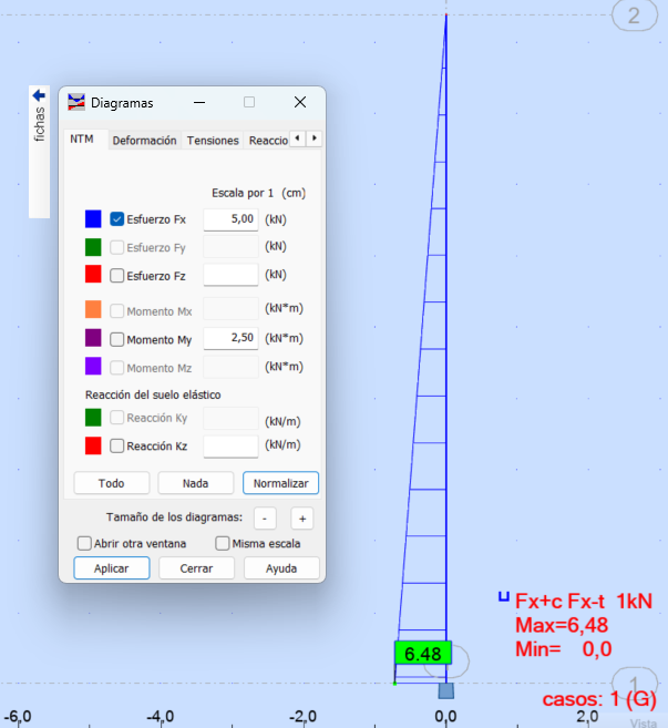 Y luego modelé la chimenea en rob-ot de manera muy sencilla para confirmar mis cálculos aplicando una fuerza de inercia.