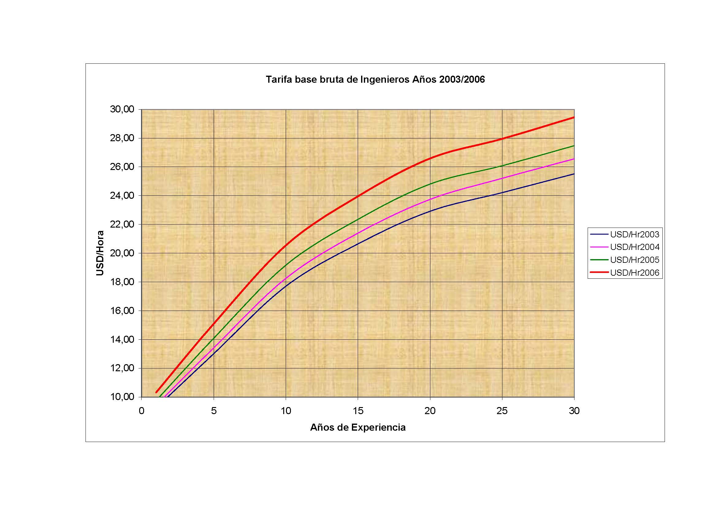 Te adjunto un gráfico USD$/Hora vs. Años de experiencia, de acuerdo a la realidad chilena.