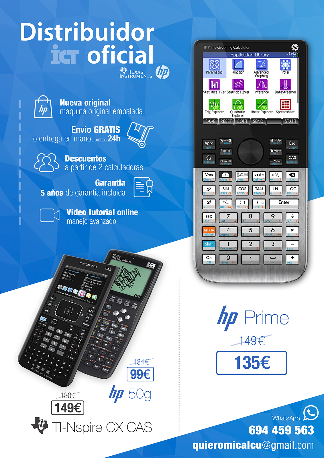 Soy comercial oficial y autorizado de HP y Texas por ICT-Iberia. Gracias a ello ofrecemos los mejores precios (ni Amazon, ni MediaMarkt, ni HP online) y el mayor tiempo de garantía (5 años). Tendrás tu calculadora nueva con el embalaje original y envío Nacional e Internacional Gratis en 24h en tu casa. Incluimos acceso a un video tutorial online para que aprendas el manejo total y avanzado, así como la inserción de PDF.